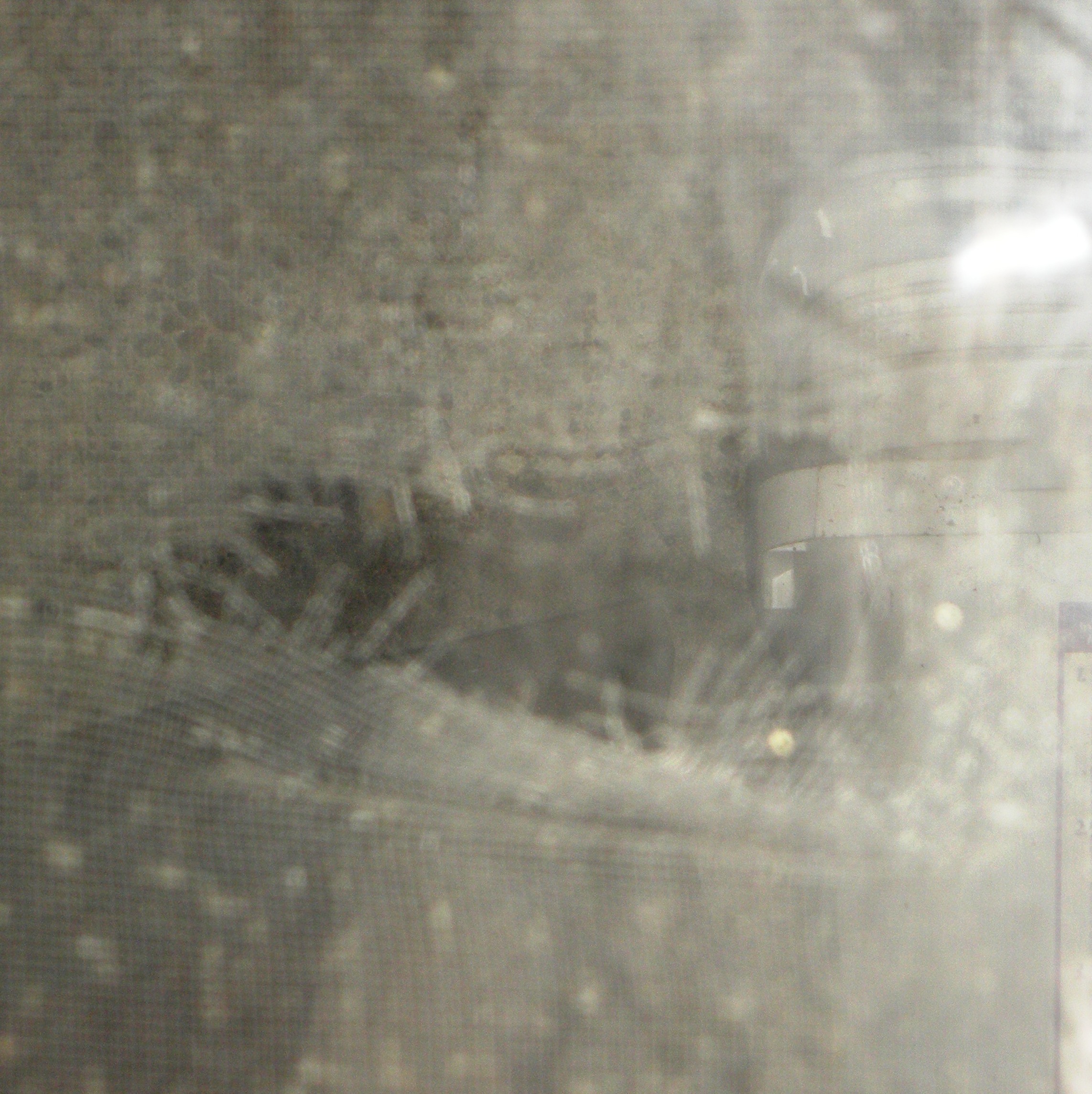 The window in our bedroom is probably his favorite. It’s a small window so the extra fabric from the curtains is tucked in and makes a nice cat bed. As we discovered recently, it also affords privacy. Apparently, he and Pretty Calico have been meeting through the glass like Romeo and Juliet. A couple of weeks ago I checked that window. It was a cool day and I was thinking about opening it. Bucky was sitting there so I didn’t, the window tips inward and would infringe on his space. Then about a week or so ago Geoff and I checked again for the same reason and discovered this.