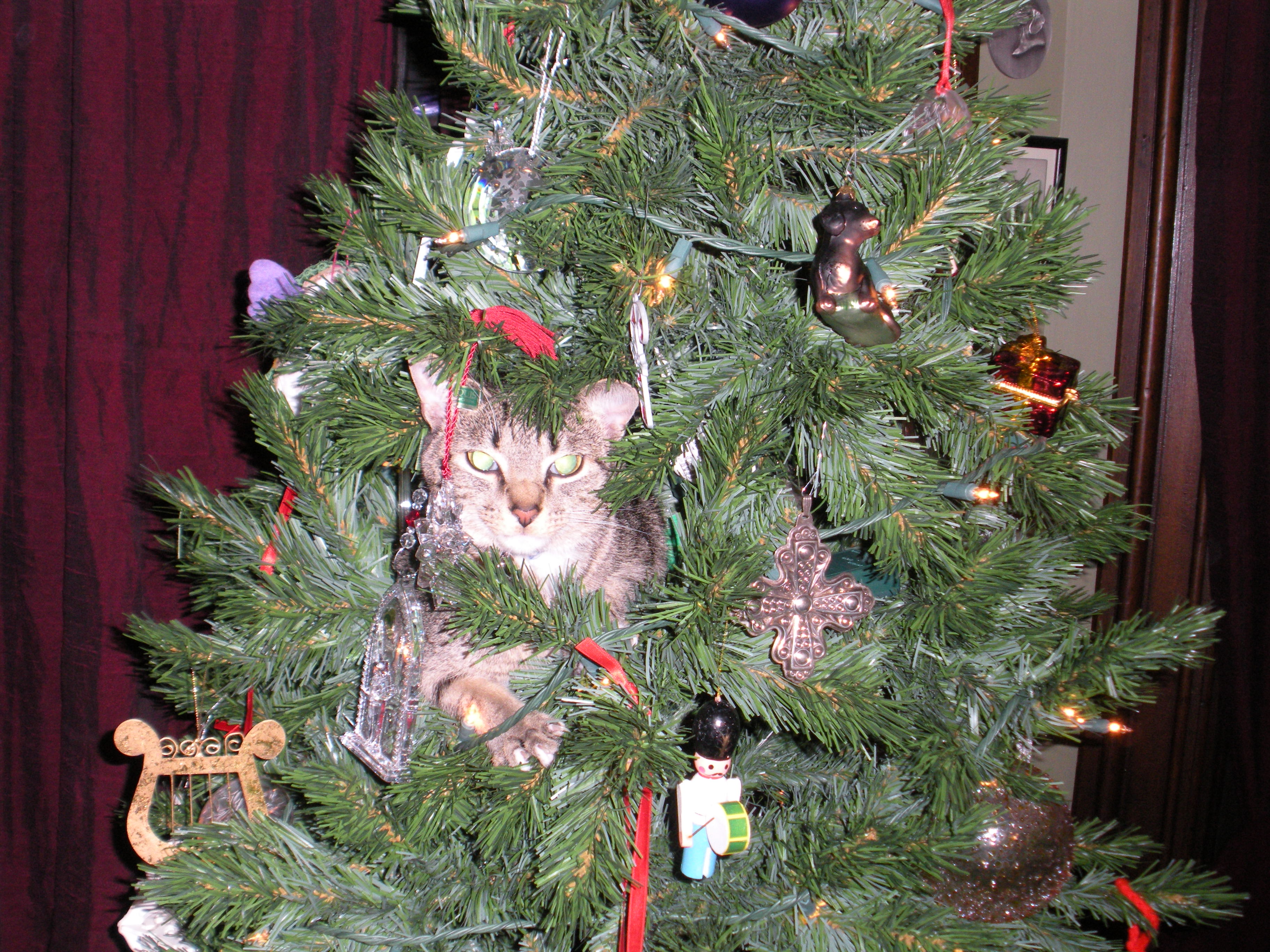 As some of you may remember, the first year that we put up the Christmas tree Scratch immediately went to work conquering it. Not only was he absolutely sure that by climbing it as close to the top as possible he was dominating it, he also would spend hours carefully removing any ornament he could, either while sitting on the floor, sitting on a chair, or from within his perch in the tree itself. It is nice to know that we’re not the only people who have this problem.