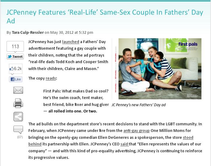 JCPenney has issued a new Father’s Day ad campaign that really makes me smile. It features a family with two dads. And it turns out this is an actual family, not just actors portraying a gay couple with children.
