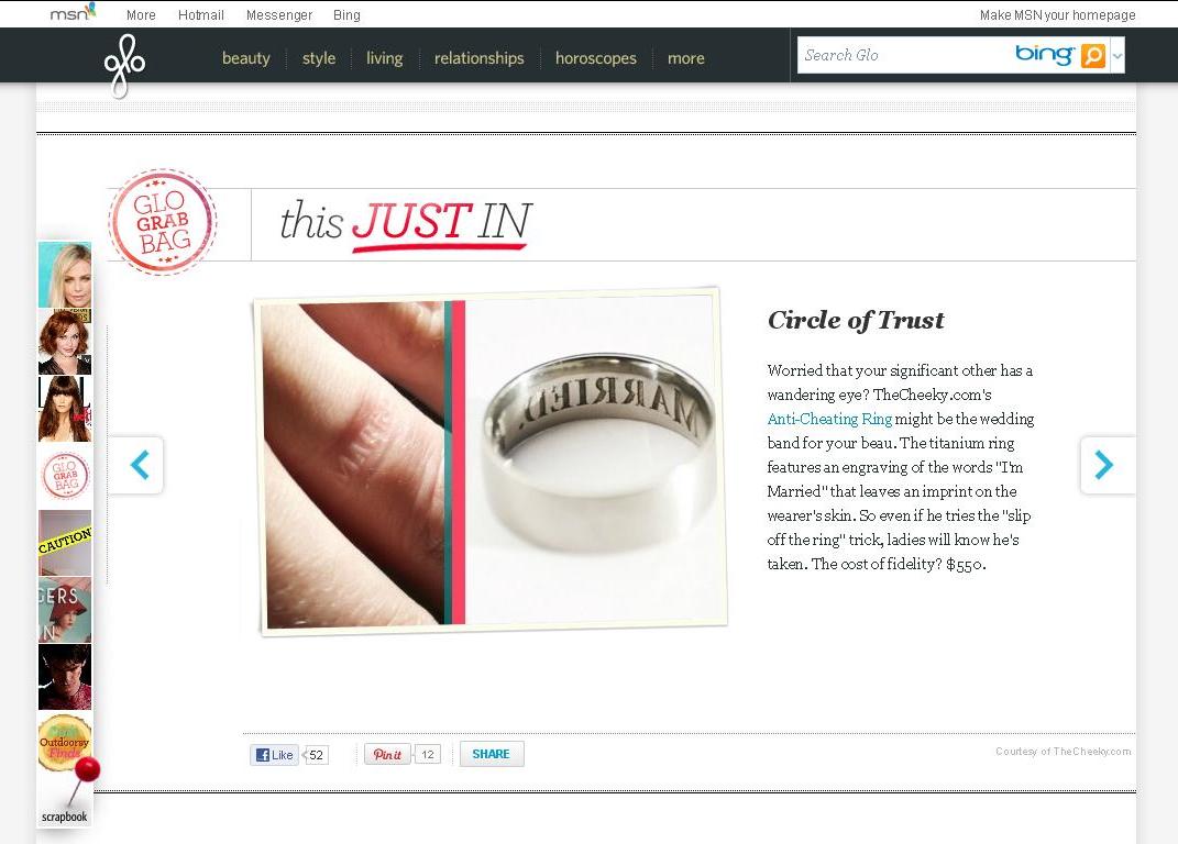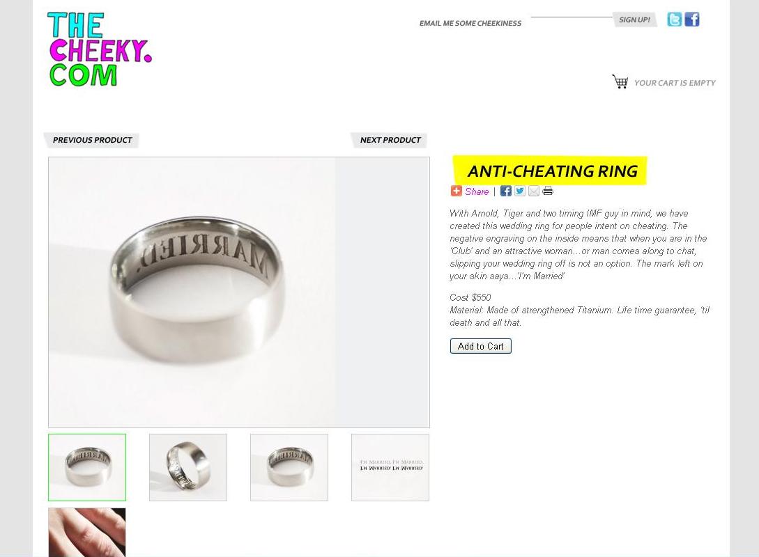 The trope of the cheating husband who hides his wedding band in order to step out on the wife is an old one. Older still is the concept that it is somehow the wife’s job to stop him. Like she has to GPS tag him or tattoo him as her own. Call me humor impaired, but this does nothing to encourage women to have some steel in their spine and to toss out the guy who can’t respect their boundaries.
