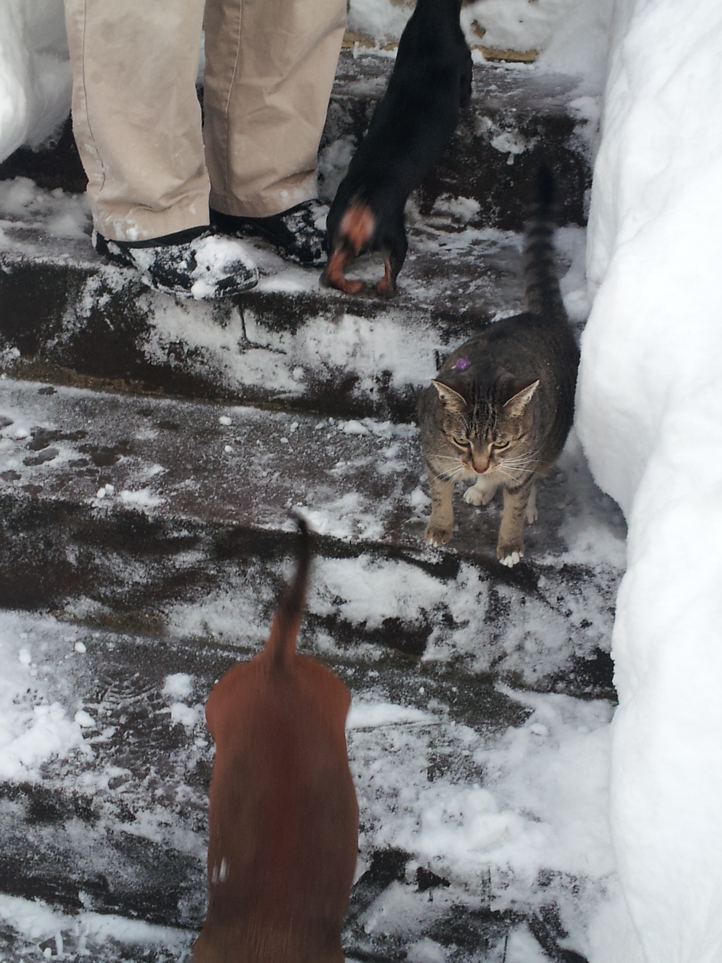 Thumbelina went right back inside. Rerun stayed briefly, made his little contribution to the snow-melting effort, and then fled back inside. Scratch stayed out a bit longer. Bucky is no fool. He was nowhere to be seen, probably curled up on our bed enjoying himself, chuckling in elder wise kitteh fashion while the young whippersnappers of the family made their pathetic foray into the howling wilderness, the harsh snow-swept tundra of the People’s Republic of Cambridge.