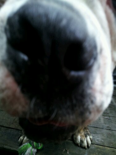 That would be Mugsy waiting for me to throw the rope toy we were playing with.  It was a toy I bought a long time ago for the dachshunds but they never showed the slightest bit of interest in it.  Mugsy had a great time with it and made sure to kill it repeatedly.