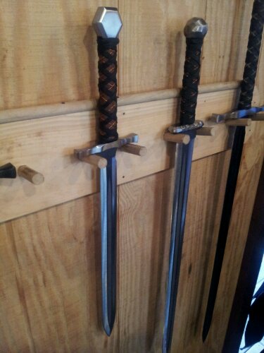 Geoff has been wanting a “bastard” sword for a long time. For those who don’t know, a bastard sword has a hand-and-a-half grip, it’s neither a single handed grip or a two handed grip. He found one on this wall he really liked.