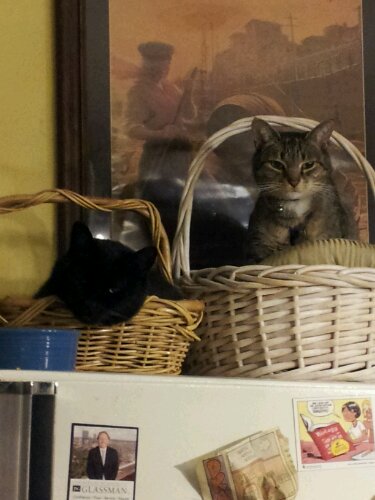 When we decided to put a second basket on top of the upright freezer as a cat bed, we had hoped that eventually the cats would be able to use them at the same time. And so they have.