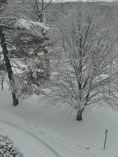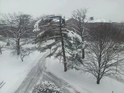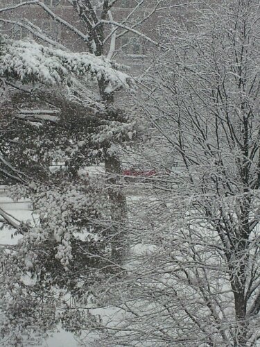 Looking out onto Divinity Ave in Cambridge. These snowflakes were a couple inches across.