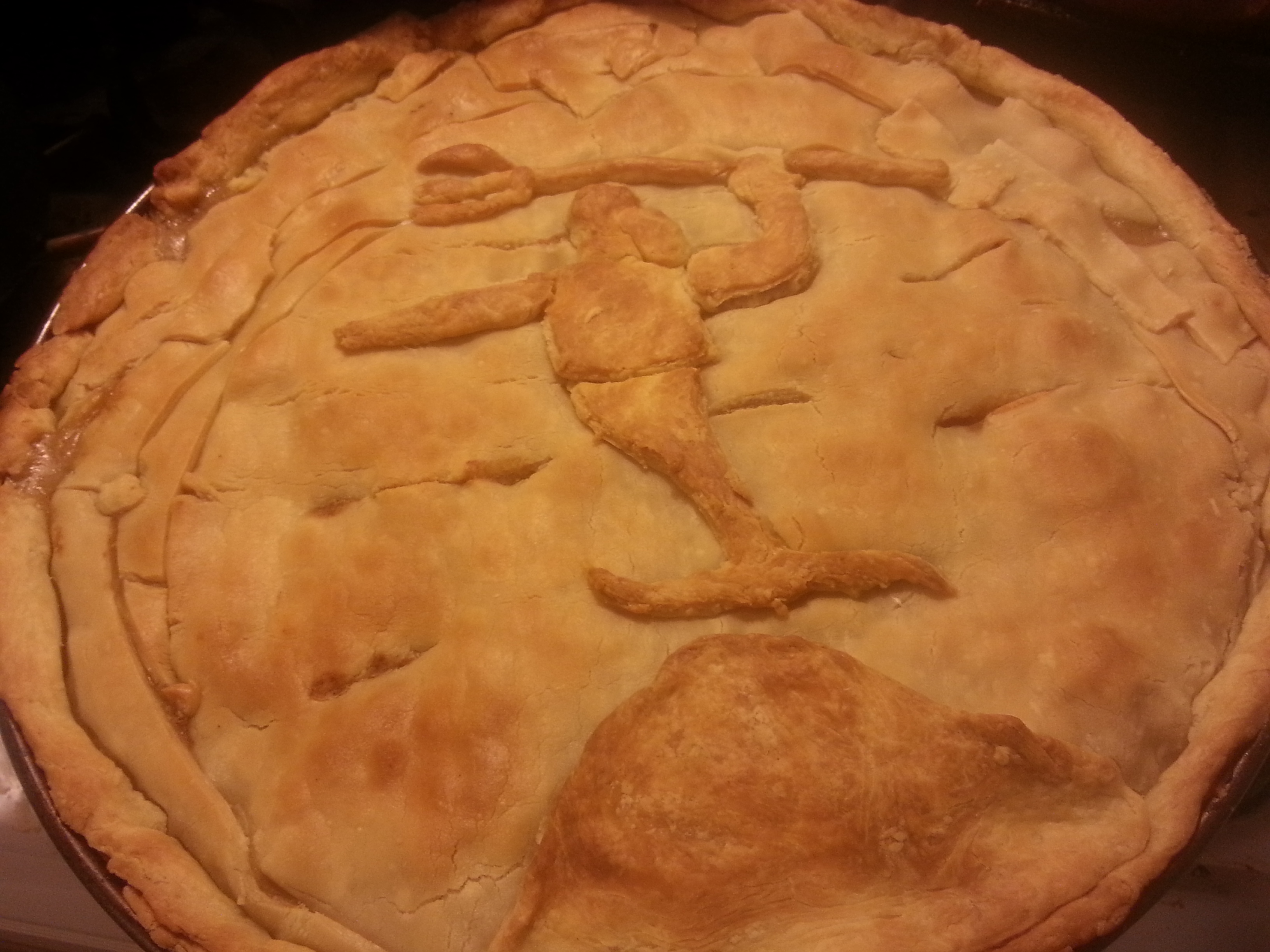 1) The book describes the pies as being huge, so I thought making it larger might be cool. I have a deep-dish pizza pan that seemed ideal for the purpose. It is certainly more wheel-like, anyway.