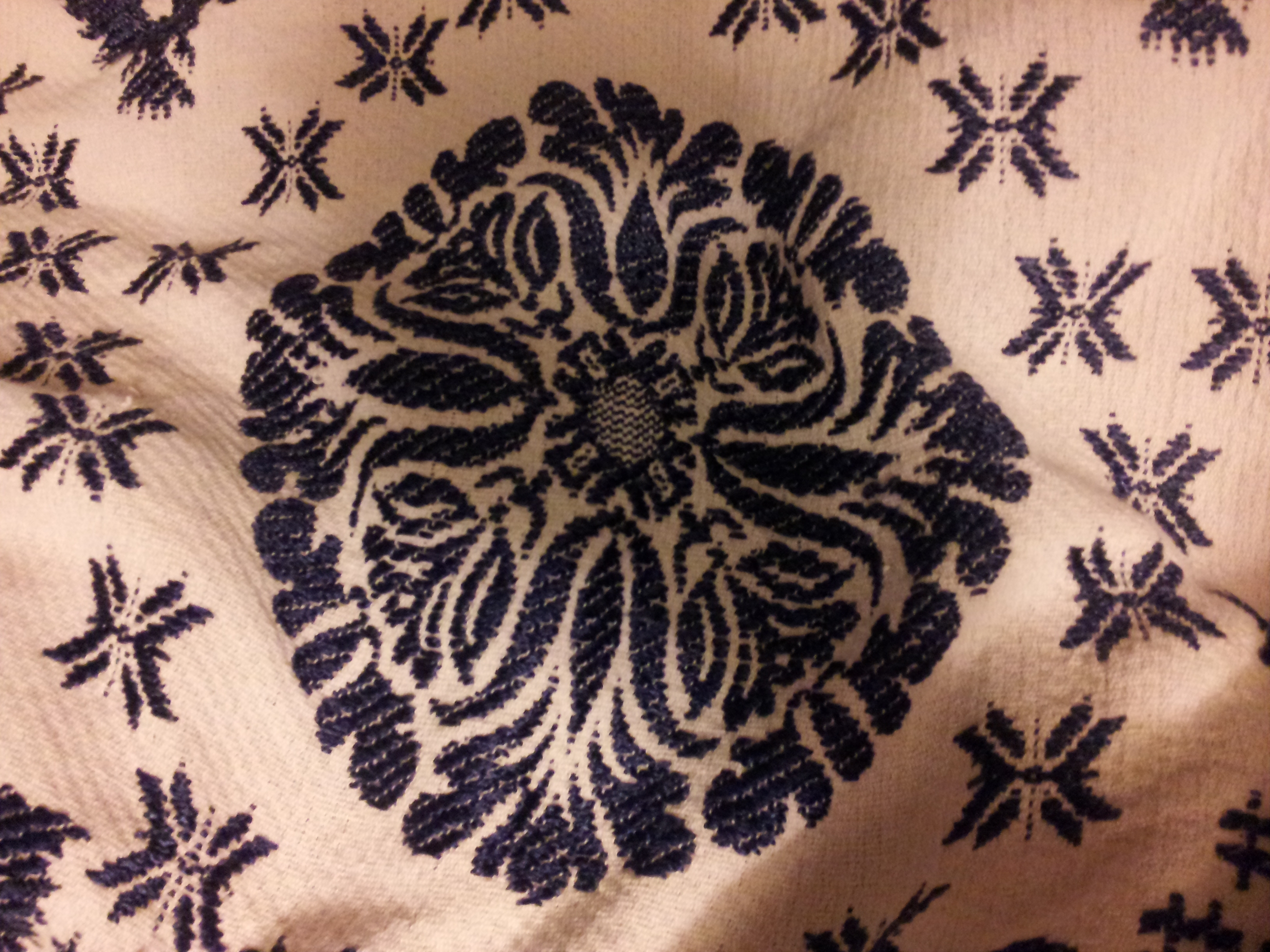 The blanket was $10 and after a lot of soaking and several runs in the washing machine, it’s in perfect condition. That’s good old-fashioned American craftsmanship for you. I’m still tracking down the pattern, but I am sure on the maker. (Tags help.)