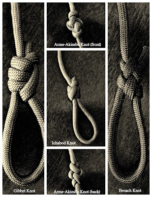 4) A variety of knots were used in nooses over the centuries and in various countries. The one shown above, in the stock photo, is a more recent one. A “Gibbet” or “Ichabod” knot would have been more common earlier in US History and certainly in the time of the Witch Trials. See photo below for a distinction.