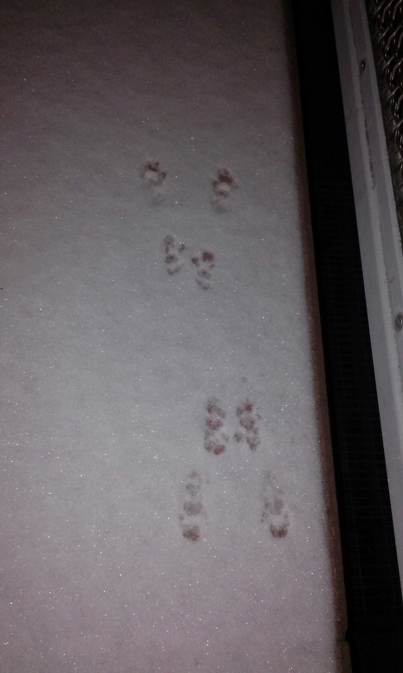 A lot of people will tell you that animals leave footprints on your heart. I won’t disagree with that. They leave footprints on your heart, your soul, your pants, the sheets, pretty much any place they can get their feet. The ceiling? I wouldn’t put it past Scratch. Anyway, after I closed up yesterday and started the inky dusk, not quite dark, walk home I noticed these. And they made me smile.