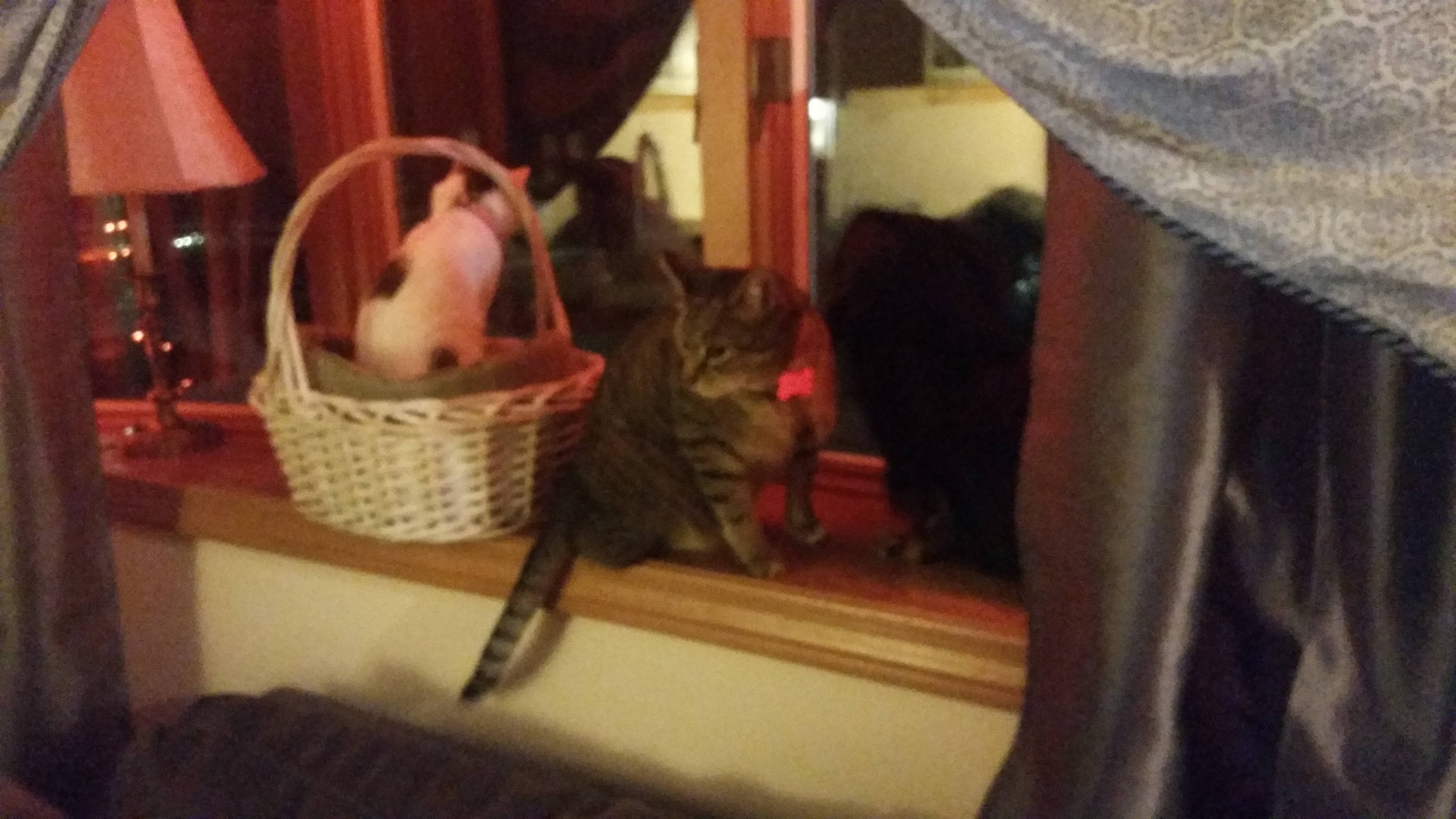 Now, that is our big front window in the living room. And now that we have a couch underneath it, it is a lot easier for all the animals to get up there (except Thumbelina, who at 15 doesn’t seem particularly interested in climbing in the window). So there are some occasions when we have three animals in the window: little Violet, in her basket; Dash, the dachshund who sometimes wants to be a kitteh; and Scratch, the cat who often wants to be a puppeh.