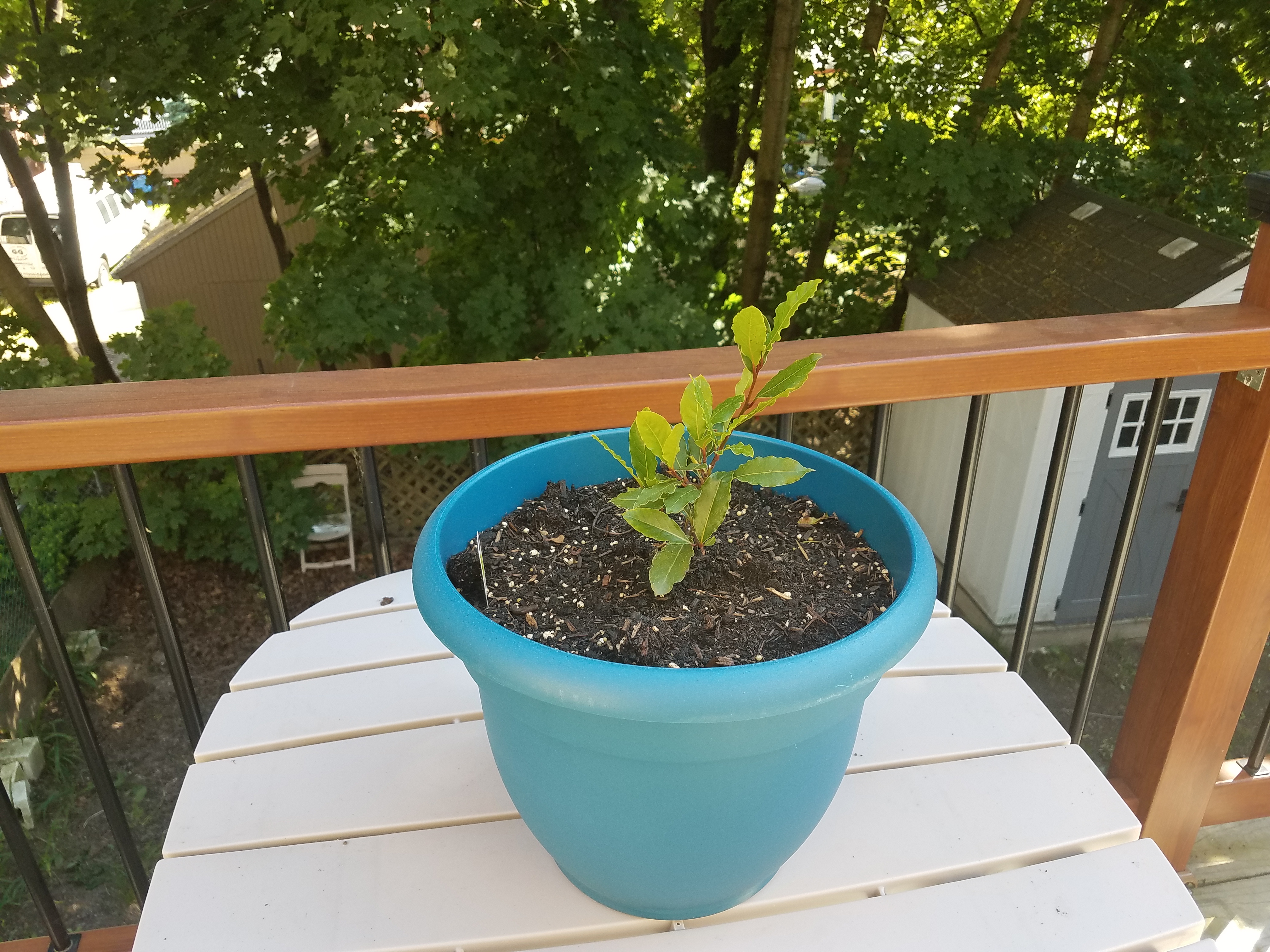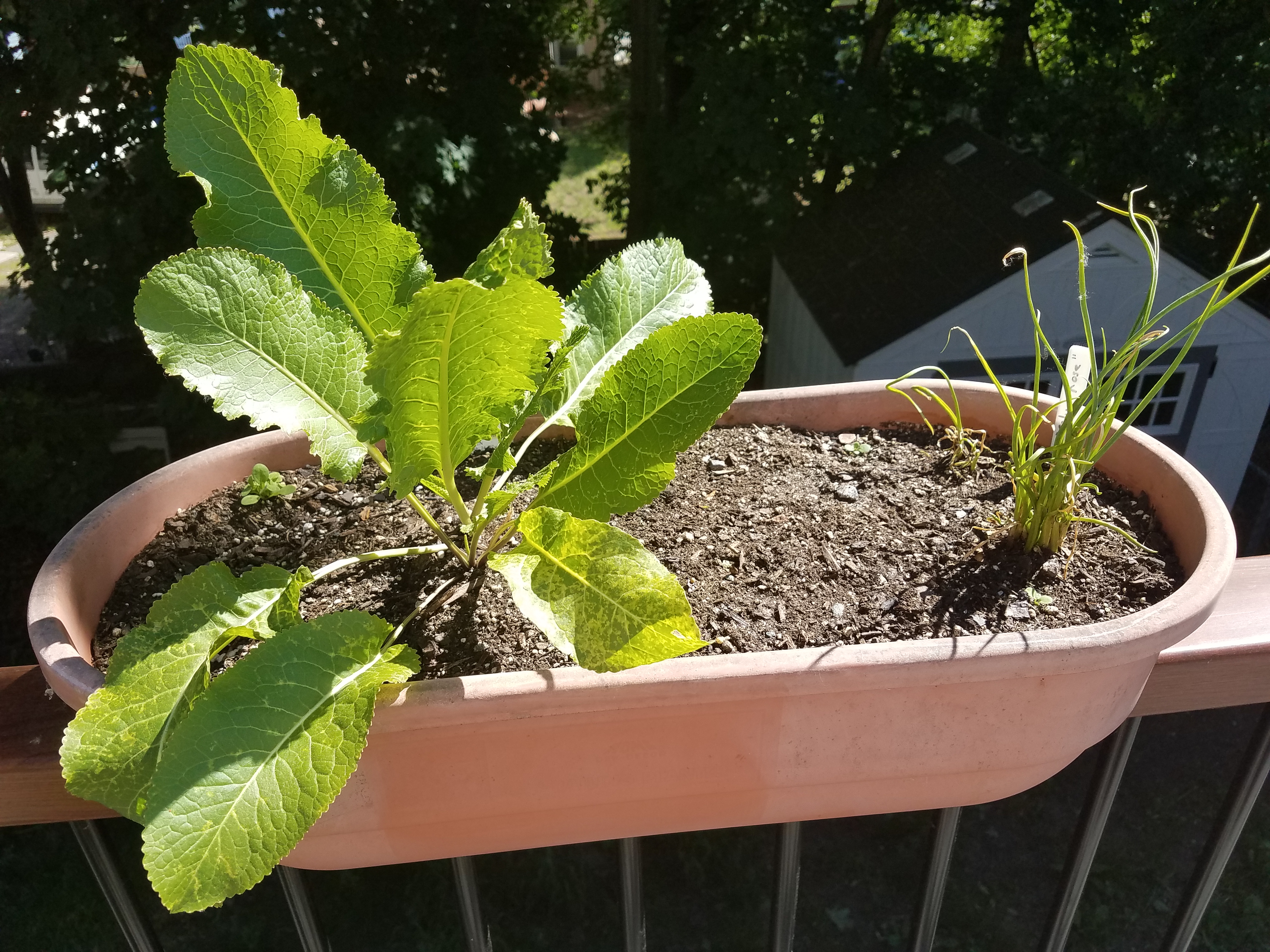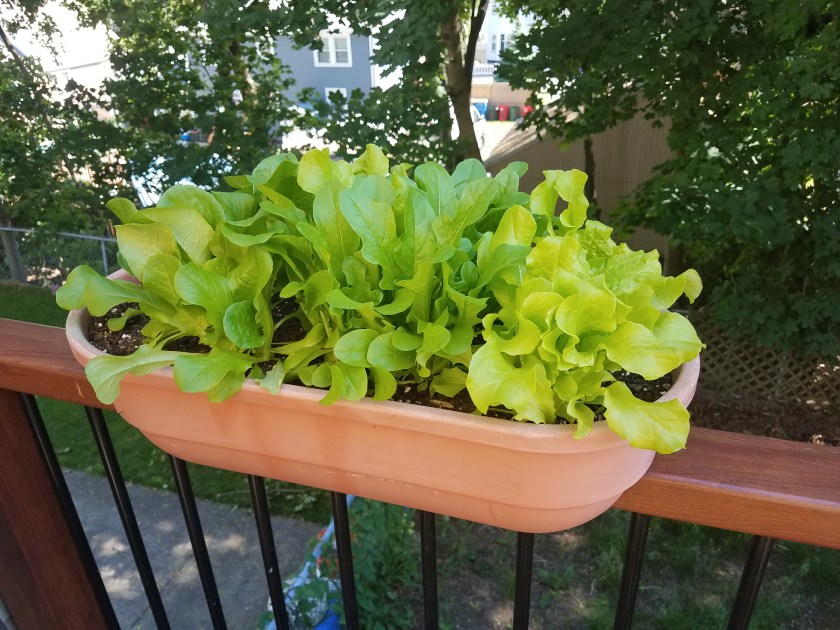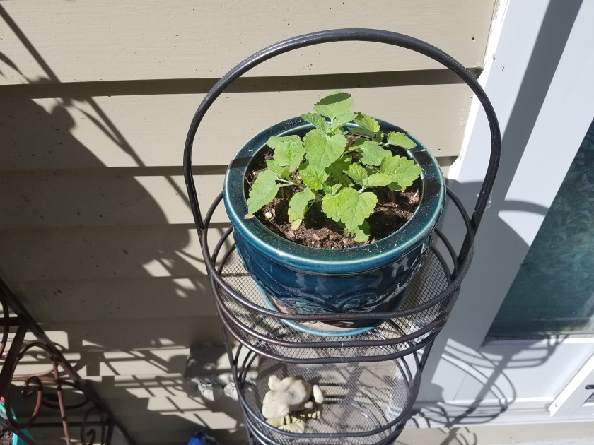 I think we have two catnip seedlings that have survived, and this is one of them. I can hardly wait to see how Violet reacts. I already know that Scratch is quite the little catnip addict.The horseradish is MUCH bigger than it was in the last photo. And the garlic is still doing well also.The lettuces are doing great! I have to pick it now just to make room for it to keep growing. Limestone Bibb, Black-Seeded Simpson, and some kind of Oak Leaf (can’t remember the specific variety).Bee balm – great herb for attracting pollinators like bees and butterflies.One of my favorite herbs, bay laurel. Note the new leaves. Keep growing, little bay bush! You’re going to come inside next winter to stay alive.Lemon balm – a great herb for teas, and this one is growing like a weed. Good thing it’s in a big pot.From top to bottom: sage (only sage seedling to survive so far, got cut off in the photo); cilantro (yay!); and MORE catnip. Note the second lettuce railing box in the background.