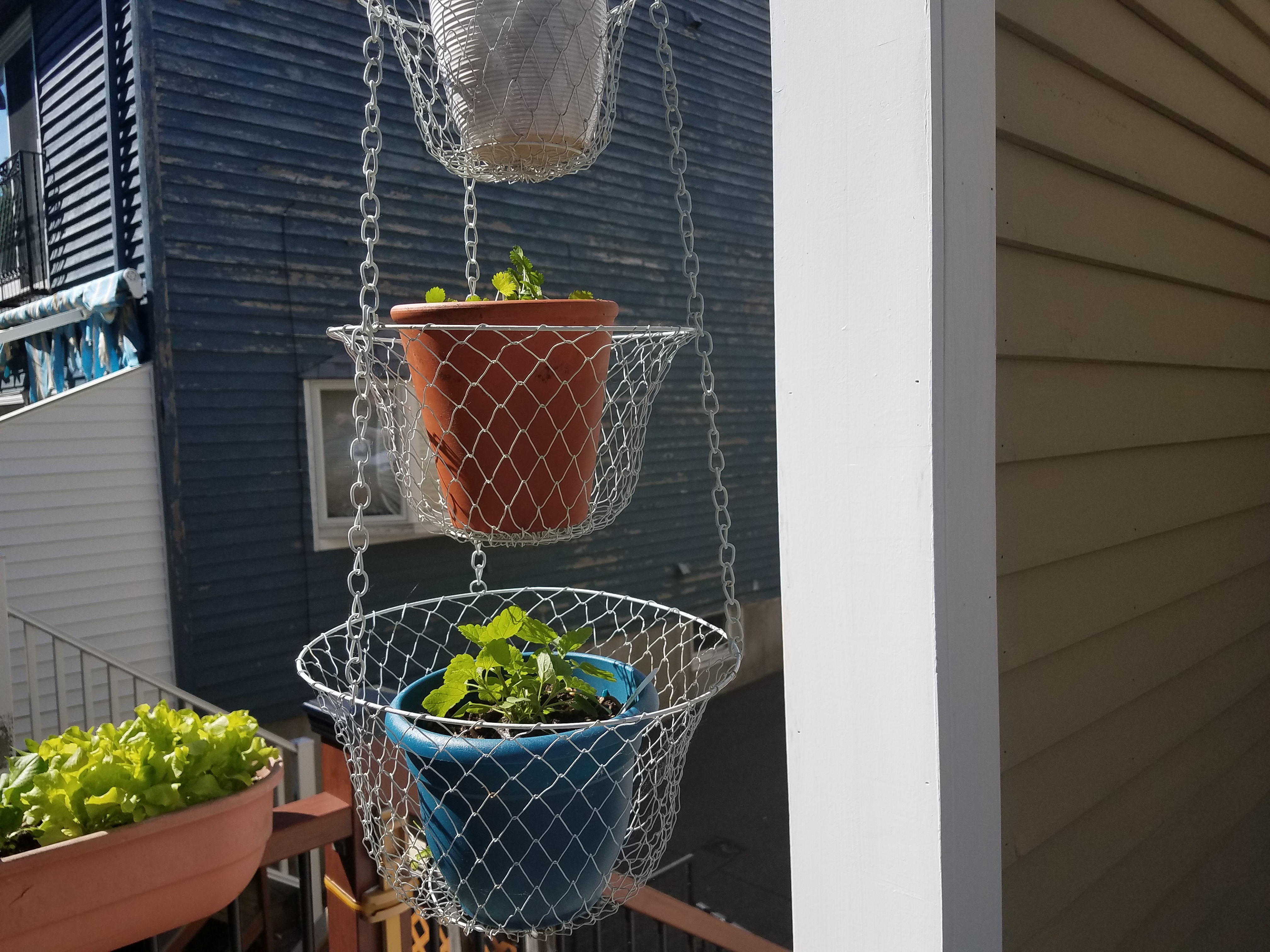 Not shown in this round of photos: carrots; spinach; and pumpkins. All of those are planted in the raised bed down in the yard and so far seem to be doing ok despite the shade.
