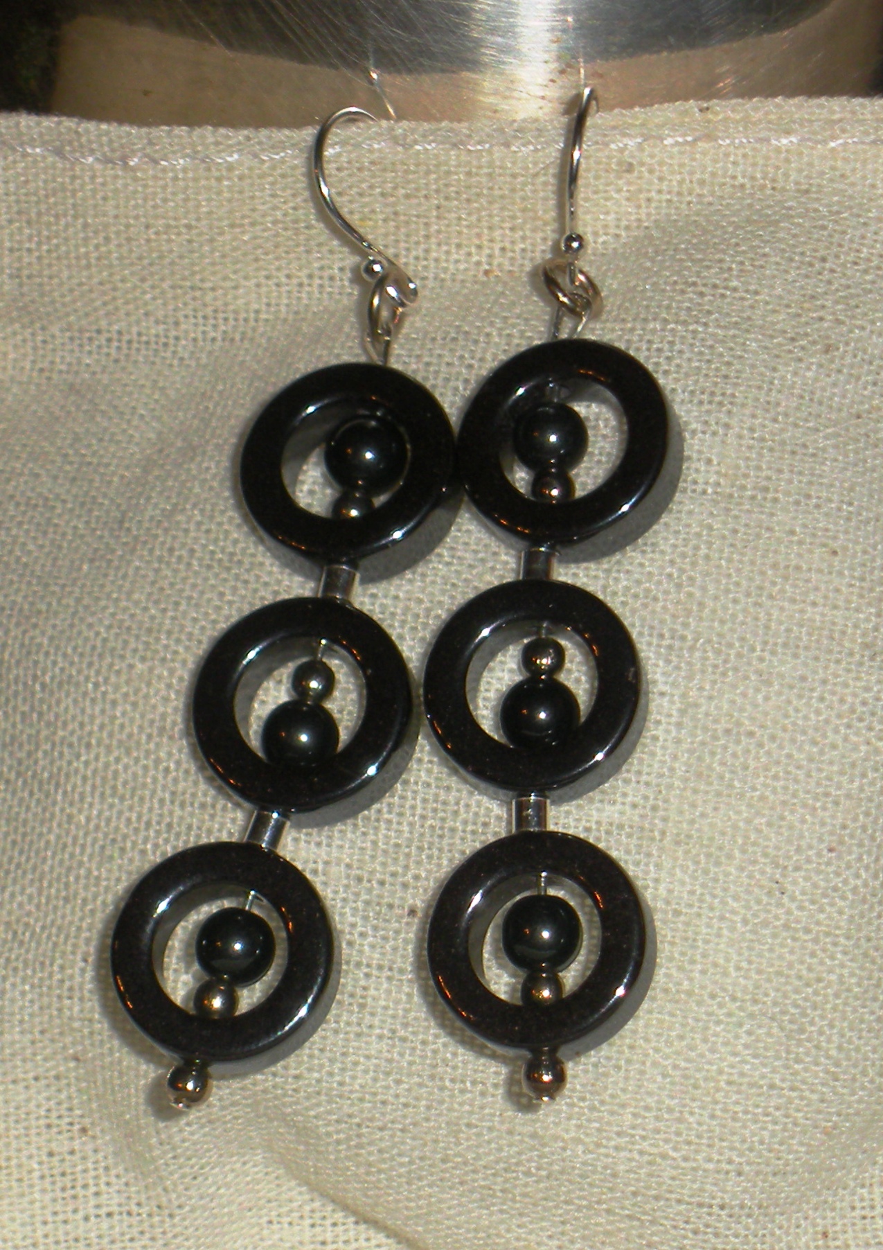 Sterling and hematite. These are shoulder dusters. They have a 4 inch drop and are 1/4 inch wide. $20