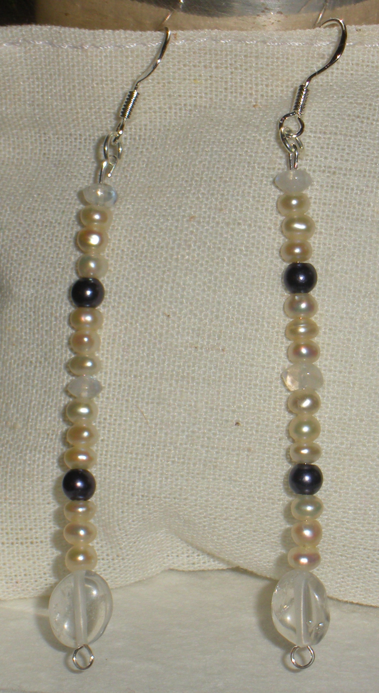 Sterling beads, moonstone, and rock crystal. These have a drop of 2 1/4 inches and are 1/4 inch wide. $24