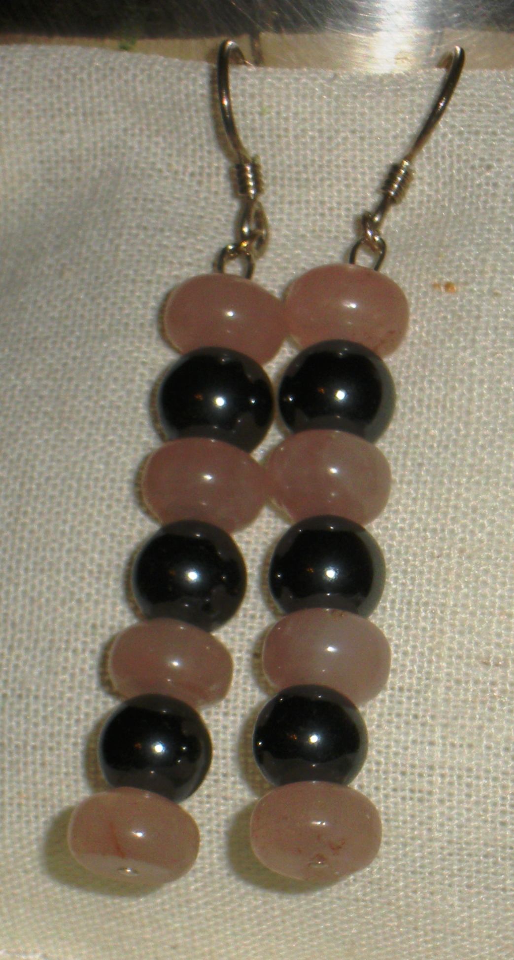 Rose quartz and hematite. 2 1/4 inch drop, 5/16 of an inch wide. $22