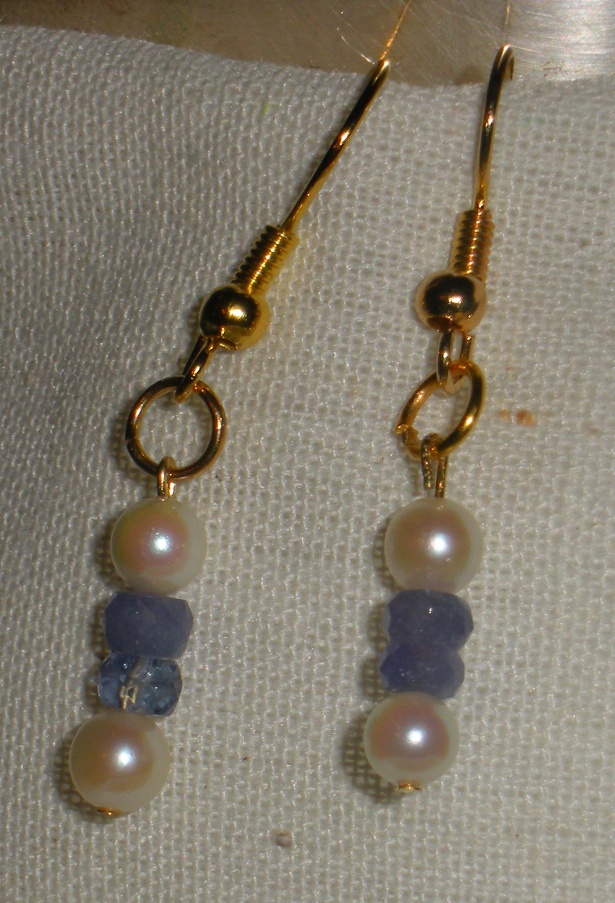 Cultured pearl and tanzanite. 1 3/8 inch drop, 1/8 inch wide. $18