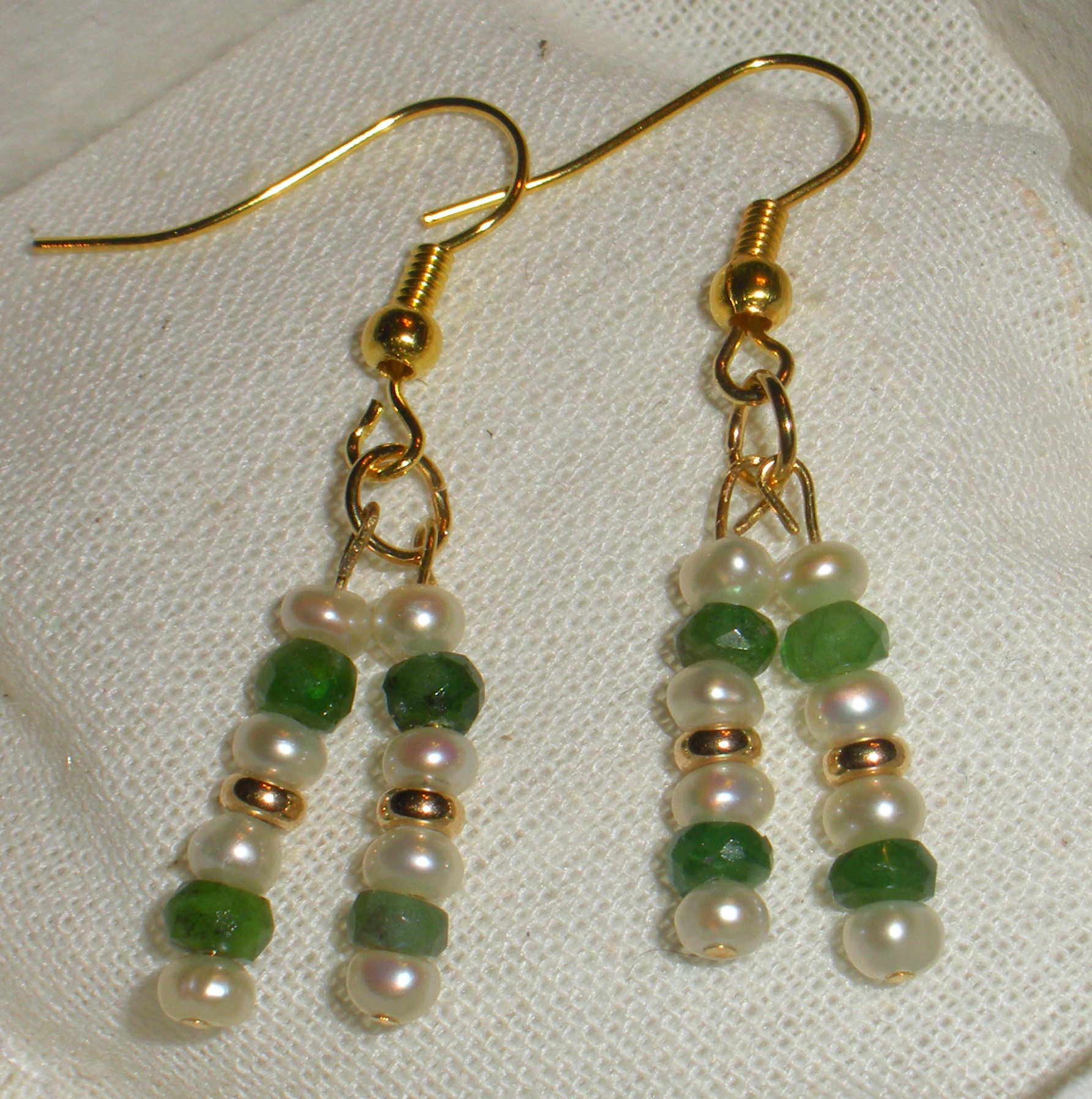 Freshwater pearl, tsavorite garnet, and 14k gold beads. 1 5/8 inch drop. Width varies but averages between 1/4 and 3/8 of an inch. $27