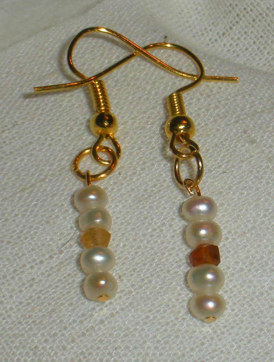 Yellow tourmaline and freshwater pearl. 1 1/4 inch drop, 1/8 of an inch wide. $20