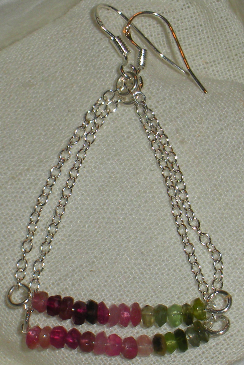 Tsavorite garnet, moonstone, vintage sterling beads, and tanzanite. These are ear wires or ear threaders. The drop, adjustable from the end of the post, is 3 inches. The gemstone portion is 1 inch long and 1/8 of an inch wide. $22