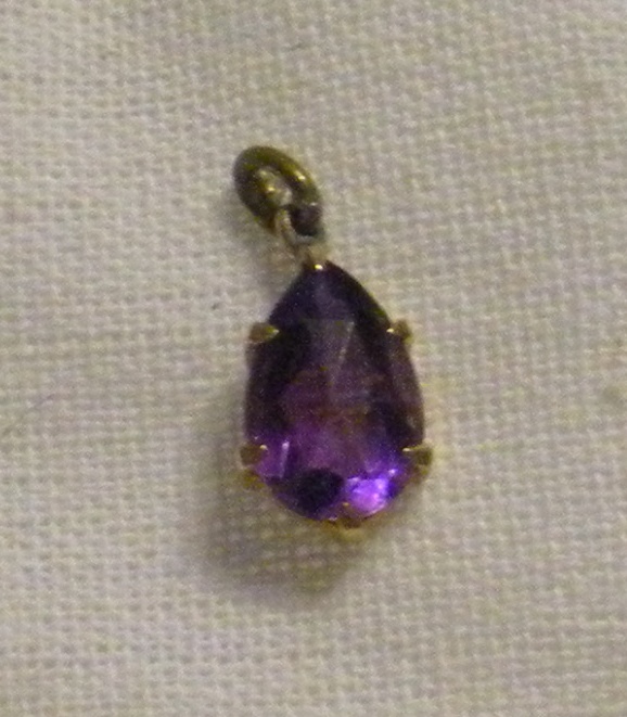 Amethyst and gold pendant. This is a old piece with a lead solder repair to the base of the bail. There is no gold hallmark but I suspect it is 10k gold. The amethyst is cut in a checkerboard pattern. 9/16 of an inch long and 1/4 of an inch wide. $25