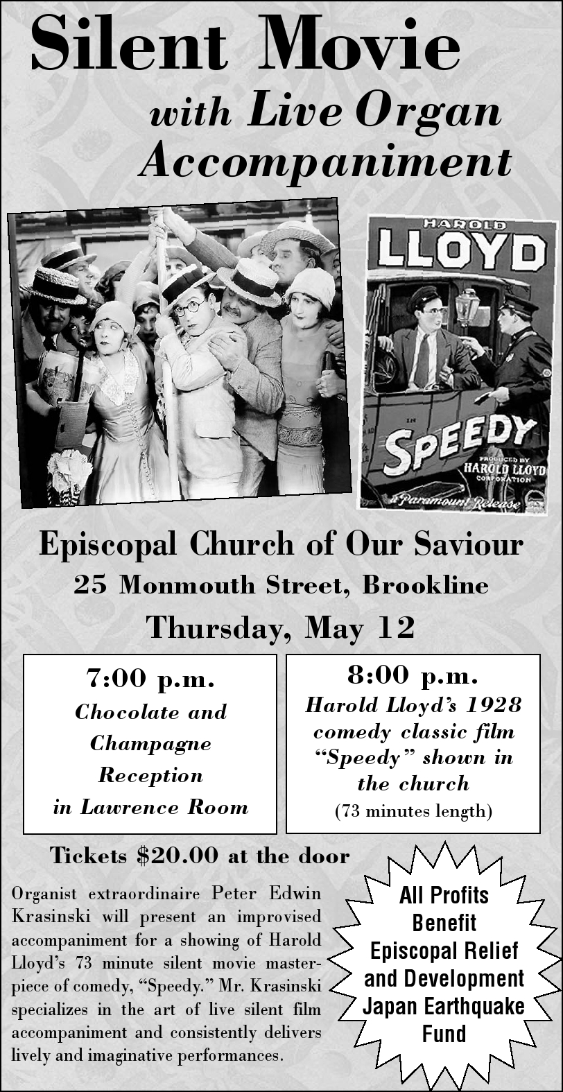 My friend, Peter Krasinski, will play live accompaniment, which will be entirely improvised on the fly, to the silent film Speedy starring Harold Lloyd. There will be a champagne and chocolate tasting before the film and the proceeds of the evening will benefit the Episcopal Relief and Development Japan Earthquake Fund. All tickets will be sold at the door so if you’re interested in going make sure to get there before 7:00pm.