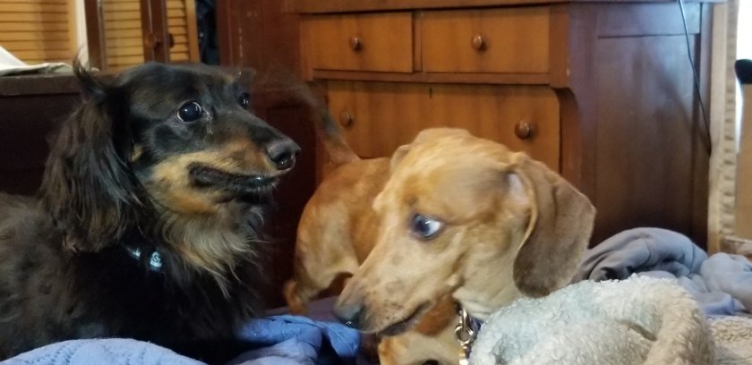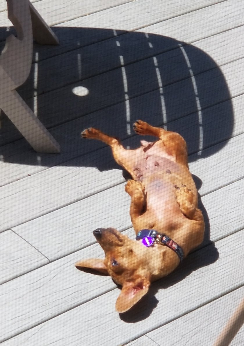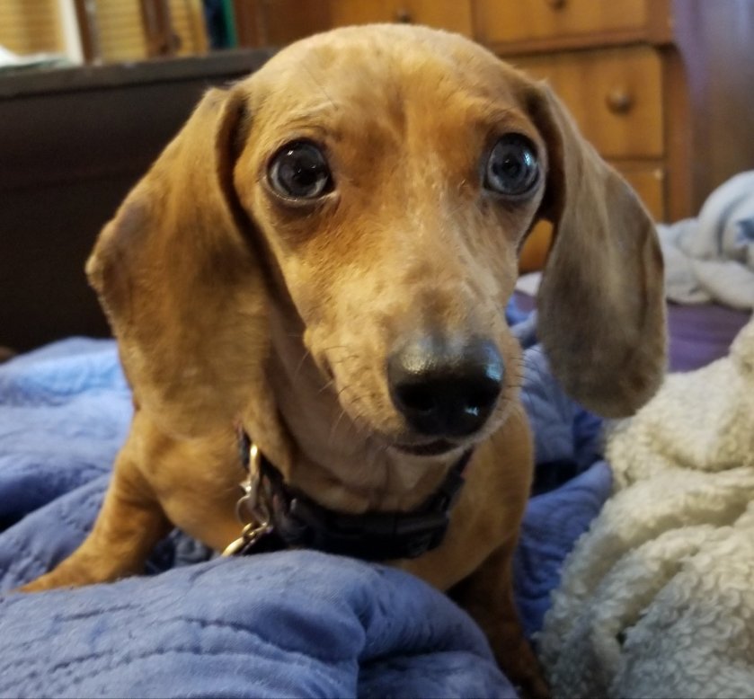 Everyone, meet The Baroness Nymeria Frieda von Hopkins-Michael. Her friends call her Nymeria. She is a short-haired dapple red boar mini-dachshund weighing about 8 pounds with startling blue eyes. She came from a rescue called Out of the Woods Rescue.