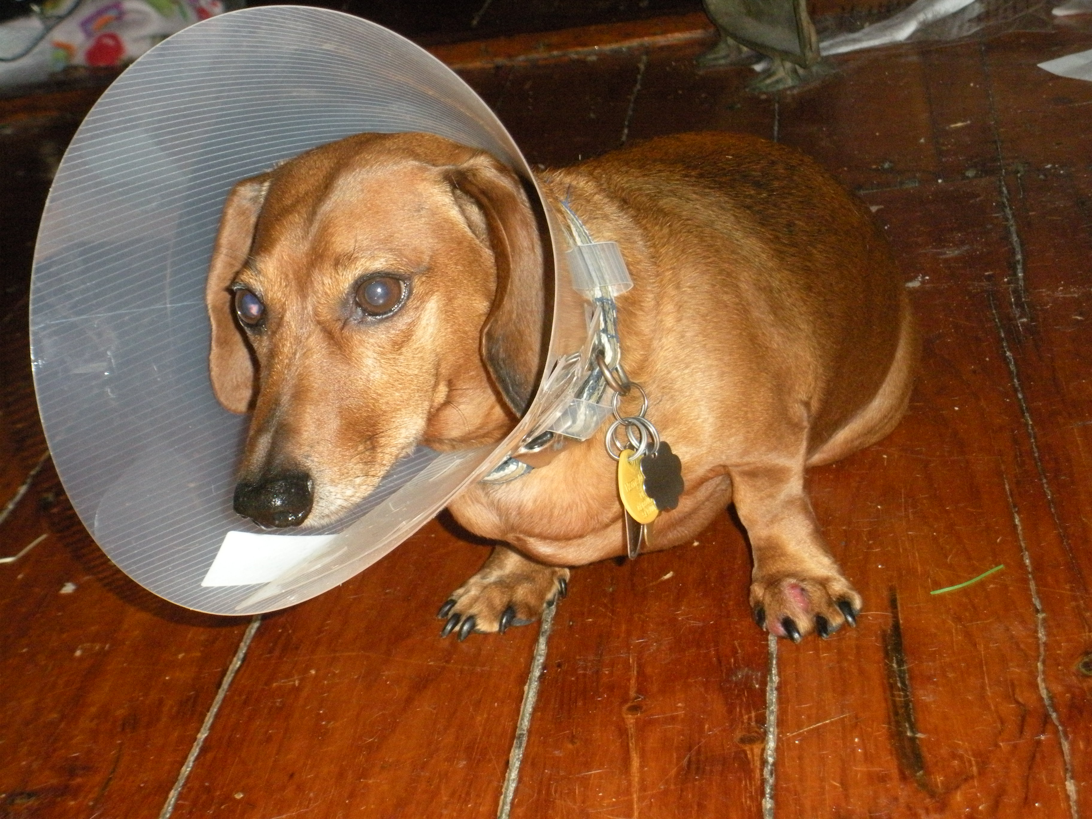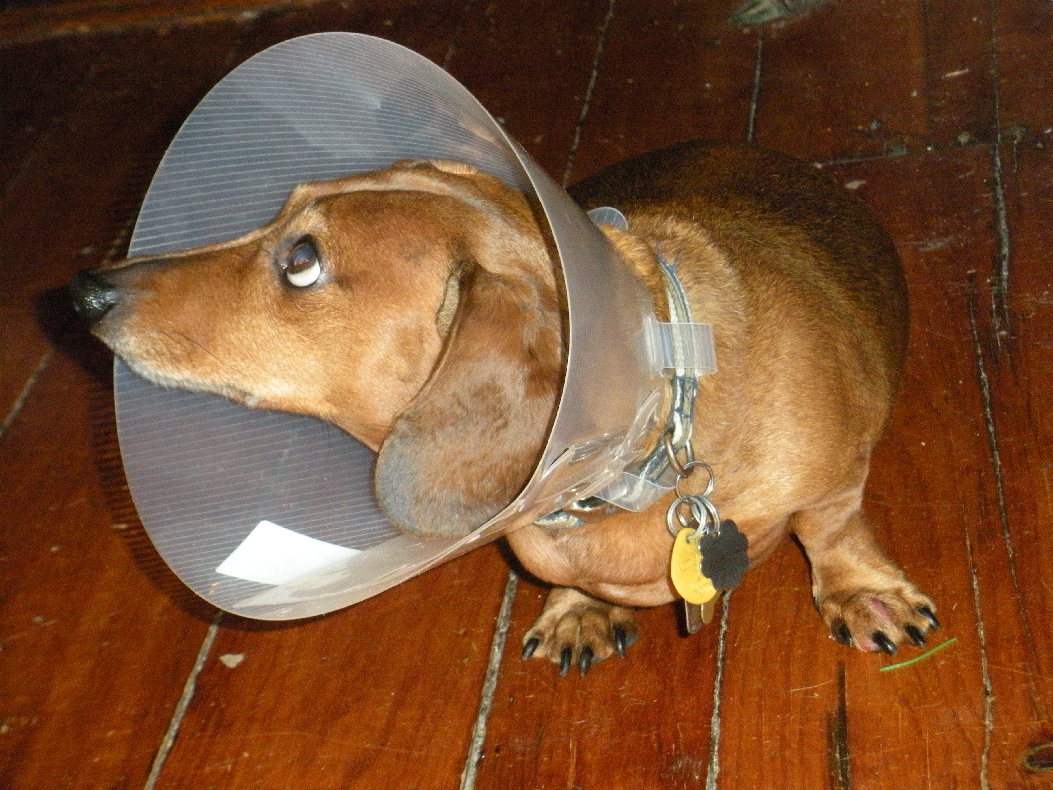 We came home with a scrip for pain meds, 3 weeks of antibiotics, and the Cone of Shame. That’s right, Rerun got an e-collar. This immediately turned him into a Zombie Dog. He came in the door and refused to move. He just lay down wherever was most inconvenient and remained there like a rock. A rock with Sad Puppy Eyes.