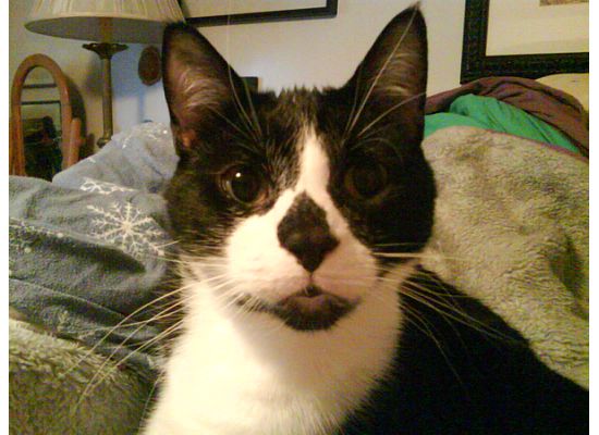 Here is Moon again!!! I think he also likes to have his picture taken. As you can see, these photos were taken at the rescue shelter before we brought them home. They have been with us only 3 days, but are acting like they own the house already. The first day they arrived, both kittens jumped onto Dad’s lap when he sat in the red chair. That is what he misses most about Maxx, the chair time, so he was very happy. Meezer stayed on his lap, but Moon climbed up on his shoulder just like Maxx used to do.
