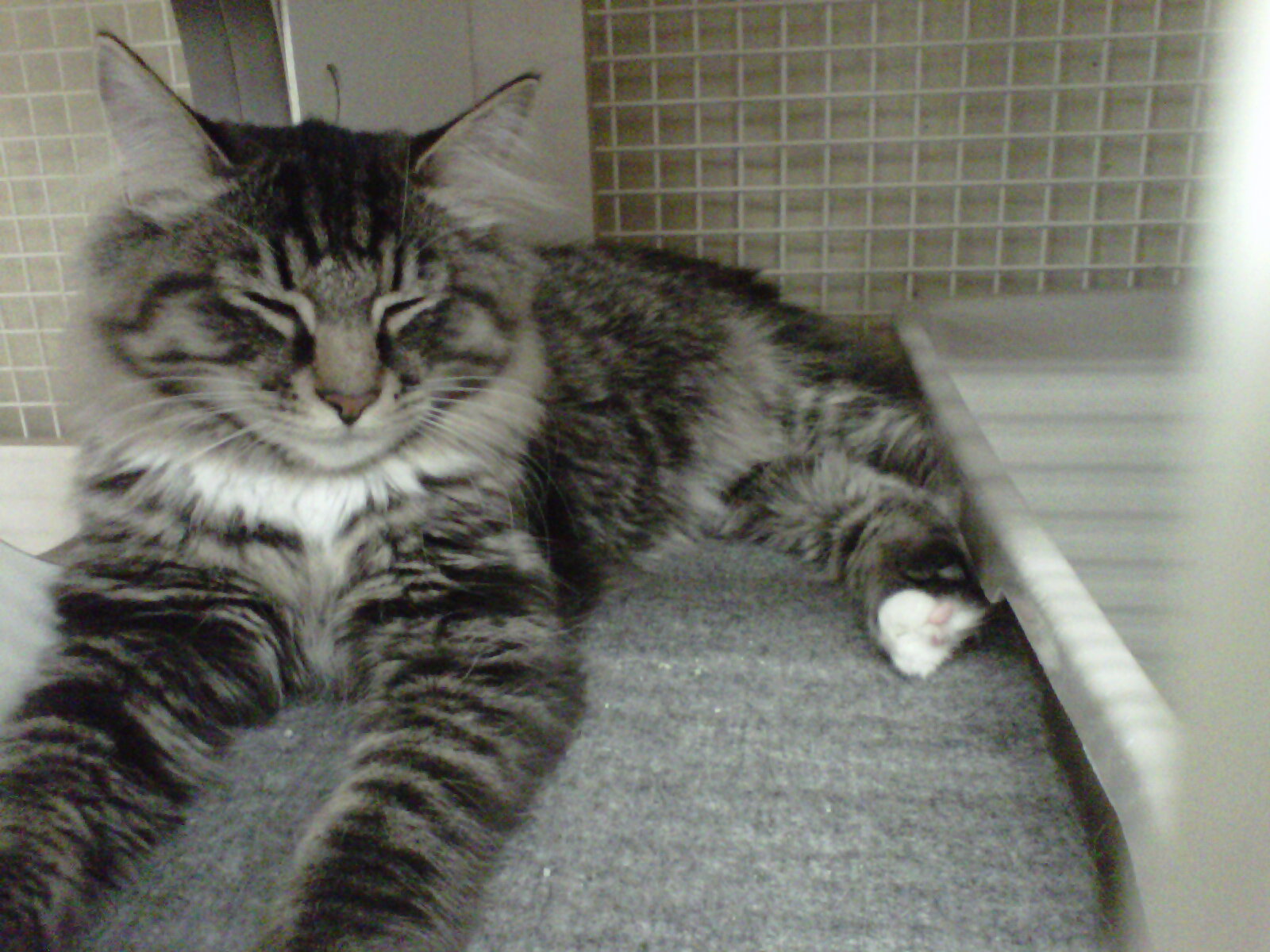 Moon woke me up this morning at 5 am, by climbing under the covers and sleeping on my pillow. Without using his claws, he grabbed my face and started licking my chin. How can you not like that? I am wondering if this is basic Maine Coon behavior or did we just get lucky.