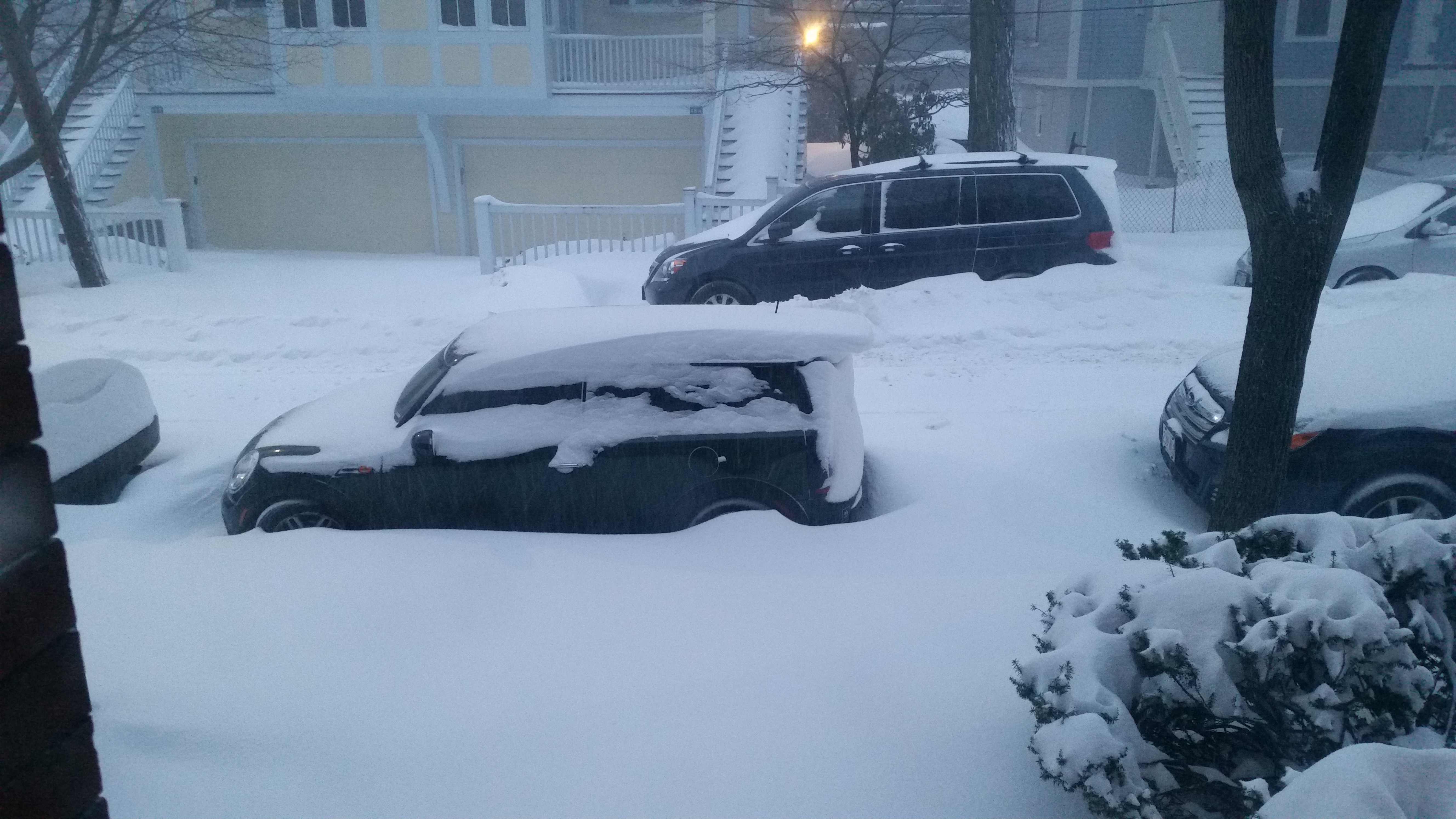I woke up a couple of hours ago and checked outside.  Dave Epstein had predicted that many of us would have a foot of snow or more by this point, and I am pretty sure his predictions have been born out in many places across Massachusetts.    I cam’t tell how much snow we have gotten so far but it looks like we have gotten enough to almost reach the top of the Mini’s tires.